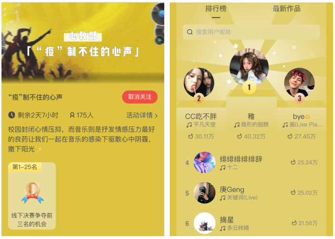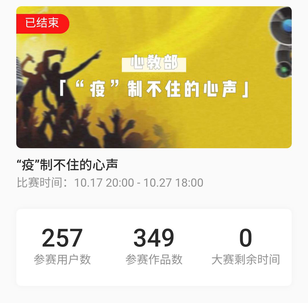 此次活动采用线上投稿的方式,通过手机APP进行投稿比拼,以综合人气作为评比标准(作品转发、评论、鲜花礼物等),不限形式不限主题,只求同学们能表达出内心的想法,抒发内心压力。活动一经推出,反响热烈,截至活动结束,共有257人参赛,349首参赛作品。