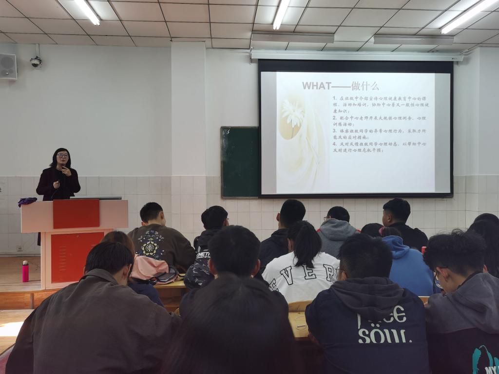 为向员工介绍和宣传心理健康课程,协助心理健康中心普及一般性心理健康知识,配合老师开展心理健康排查及反馈各班同学心理情况。伟德国际1949官网于2020年11月11号中午在教学楼E209教室开展心理健康排查与培训讲座,由心理中心老师陈莉担任主讲。