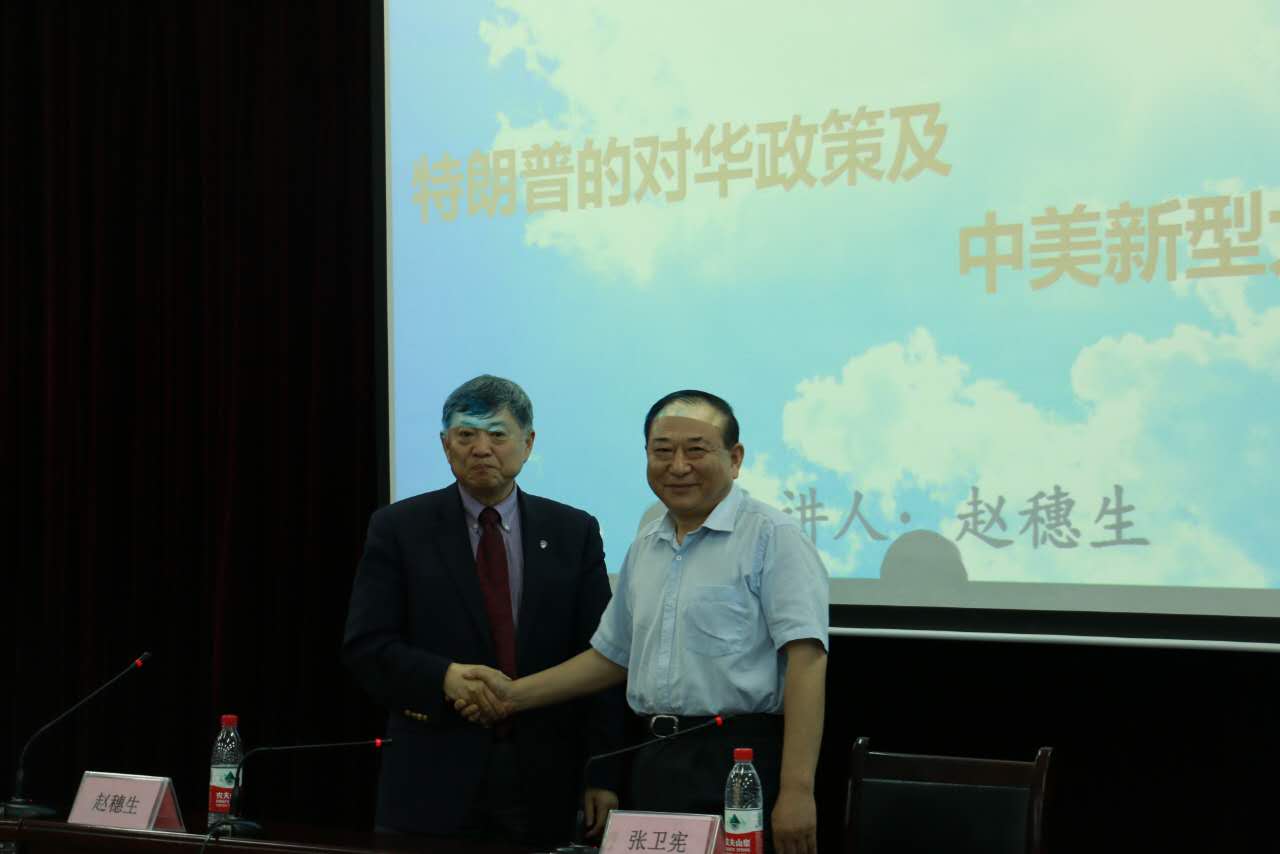 在讲座中,赵穗生教授对特朗普执政5个月以来的对华政策的变化,以及近年来习近平主席提出构建中美新型大国关系的主张作了全面系统地解读。通过对美国克林顿、小布什、奥巴马三个时期在亚太地区的战略再平衡过程的历史性分析,并指出当前特朗普政府不会也无法遏制中国深刻原因。随后,赵教授又进一步强调建立中美新型大国关系的必要性和中美关系对世界的重要意义,中美关系的核心是相互尊重、合作共赢,在寻求自身发展中兼顾对方利益,并要“风雨同舟、同舟共济、殊途同归”。最后,赵教授引用美国前国务卿希拉里的讲话——“一个繁荣昌盛的中国对美国而言是一件好事,一个繁荣昌盛的美国对中国而言也是一件好事”结束了本次讲座。