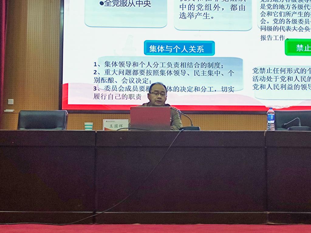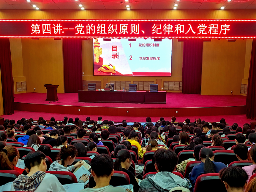 本次学习内容为“党的组织原则、纪律和入党程序”。首先,王国辉老师向大家详细介绍了民主集中制,它是中国共产党的根本组织制度,民主基础上的集中与集中指导下的民主两者的结合就是民主集中制。课堂上,同学们全神贯注地听讲,独特的讲课方法让同学们对民主集中制有了深层面的认识。接着,王国辉老师告诉学员党的纪律是维护党的团结统一、完成党的任务的保证,并且指出共产党的纪律主要包括:政治纪律、组织纪律、廉洁纪律、群众纪律、工作纪律、生活纪律,党组织必须严格执行和维护党的纪律,共产党必须自觉接受党的纪律和约束。最后,他向同学们提出要求,勉励大家自觉遵守党的“七大纪律”和“四大服从”原则。