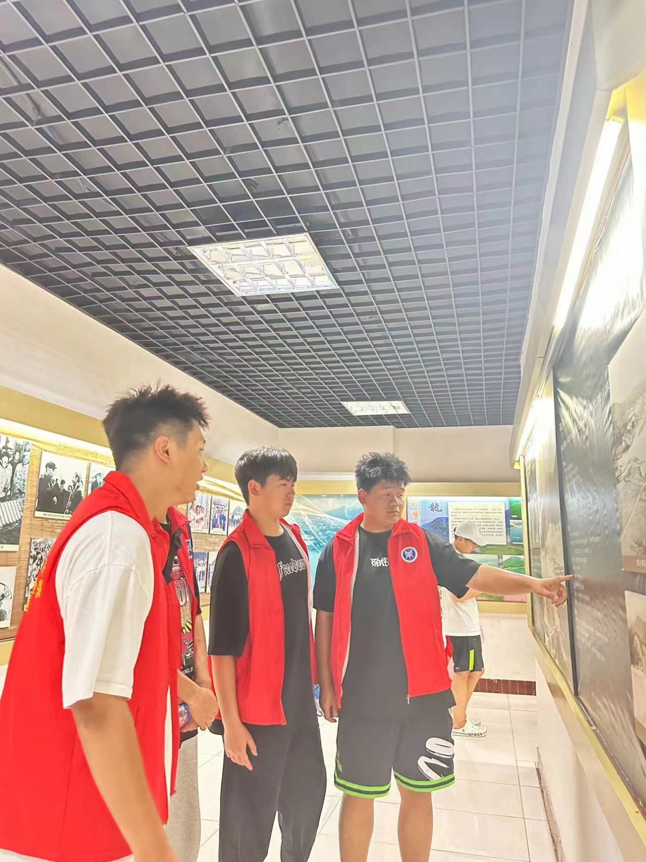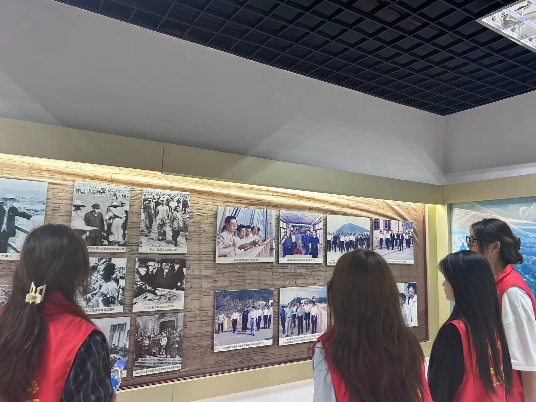 团队成员在大坝工作人员的带领下参观了在大坝边的水利展览纪念馆,第一展区通过翔实的图片和文字资料展现了75·8大洪灾发生的过程及其灾难性的影响,看到了大洪灾时的图片影像和文字纪录,看到了惨痛的历史教训,第二展区展示了建国以来国家领导人对水利事业的关怀,对人民能够幸福生活的殷切希望。第三展区则展示了新建的石漫滩水库的新风貌。从1951年的初建到1978年8月的洪灾再到1993年的复建,实践队员感受到了在面对自然灾害时中华人民的顽强不屈,和一定要搞好国家水利建设的决心和顽强奋斗的革命精神。