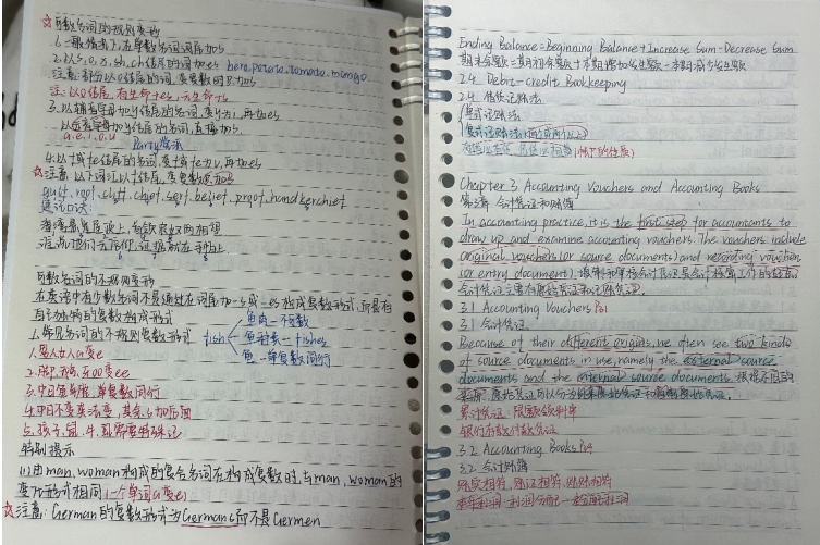 活动期间共收到三十余份课堂笔记,这些笔记内容丰富、形式多样。有的同学用不同颜色的笔标记出重点难点,条理清晰;有的同学绘制知识卡片,将知识点串联整合,逻辑严谨;有的同学在旁边附上了自己的思考感悟与疑问总结。通过评选,23国教会计(专)04宗珈如获得一等奖,23国教电商(专)03何思璇等3名员工获得二等奖,24国教物流(霍尔姆斯)01班张佳等5名员工获得三等奖。