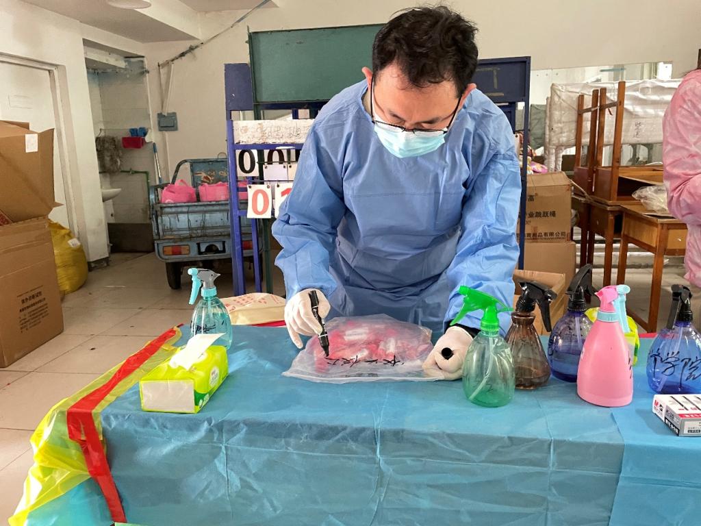 核酸检测试剂的管理与转运,需要耐心和细心,更需要一颗责任心。在接到公司任务分工以后,他第一时间给给家人先通了电话,做好家人的心理建设后,他就开始了自连续9天的核酸检测登记工作,也未曾有过一句怨言。在晴日的暴晒下,在阴雨的连绵中,在气温骤减的天气里,也在时升时降的温度中,他就如一颗钉子,每日固定时分都把自己固定在这一岗位上,静心做好核酸试剂的转运。于是,他的身影总是出现在别人午餐后,别人关上办公室门时和做完核酸检测后和在其他志愿者都已经离开后的工作上短暂休息。在忙碌的上午过后,他还在协调志愿服务、安全劝导、宿舍人数清点……在按照疫情防控要求落实各项规范管理规则的同时,着重对每一个细节的把握。“请通知没做核酸检测的同学尽抓紧来操场做,马上结束,不要有遗漏”“请各位老师明天在按照此表的时间安排到指定地点做文明劝导工作”……