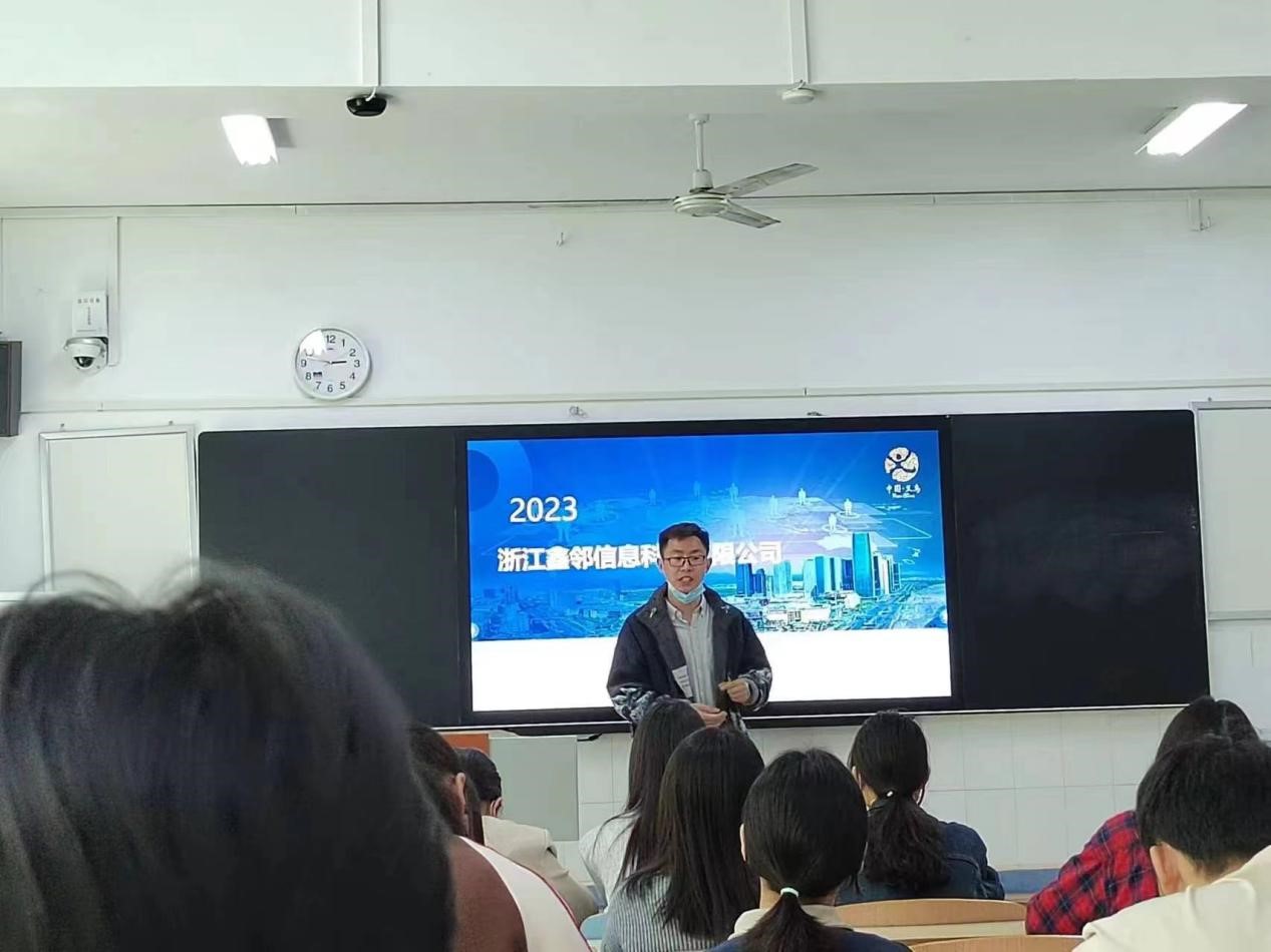 本次宣讲会企业负责人邱经理从公司的成长历程、企业荣誉及研发、生产、销售三大体系等方面讲解了该公司是一家产销研一体、全业态、全价值链的高新技术型企业。然后介绍了该公司的人才需求、薪资待遇、应聘流程、联系方式。浙江鑫邻信息科技有限公司拥有清晰的发展通道,晋升机制完善,晋升机会丰富。同时入职员工享有五险一金、法定假日、新春送福和各类活动等多元福利。在答疑环节,邱经理对多位毕业生提出的问题进行了一一答疑。通过答疑环节,让公司毕业生对岗位工作有了更为全面的认识。