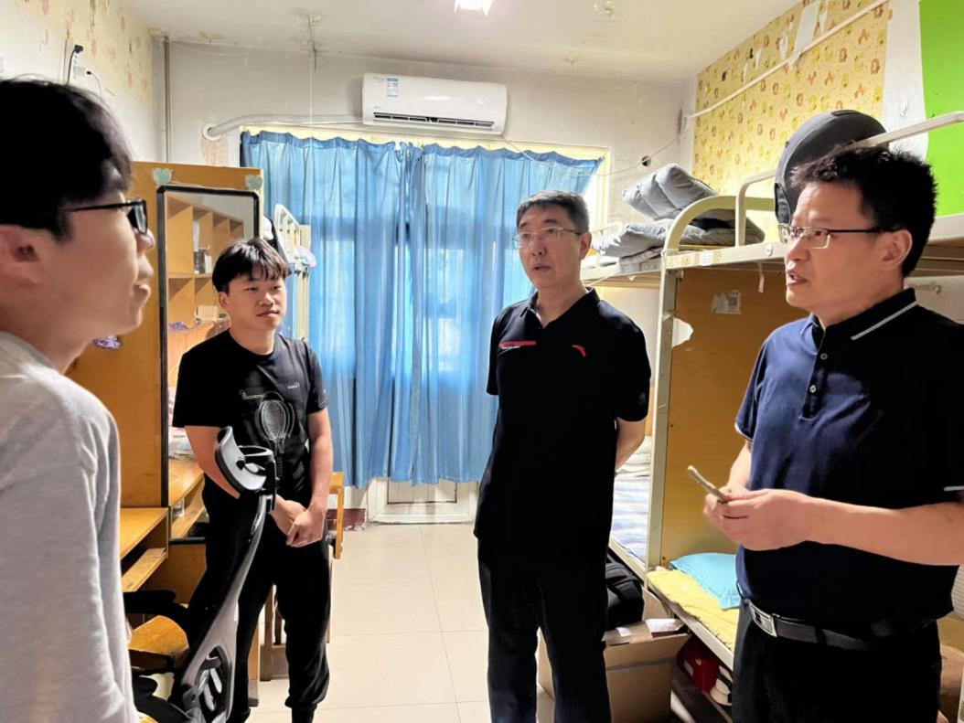 贾江、胡晓波一行逐一走访了留校员工宿舍。每到一处,他们同留校员工深入交流,关切询问了解大家食宿情况和学习计划,耐心倾听同学们的意见建议,对同学们刻苦学习的进取精神给予肯定,并提醒同学们科学合理安排作息时间,做到劳逸结合;要不断提高安全防范意识,做好高温天气防暑和防范强对流天气;要遵守暑期员工留校管理相关规定,保持信息畅通,遇到问题及时与公司和辅导员老师反馈。