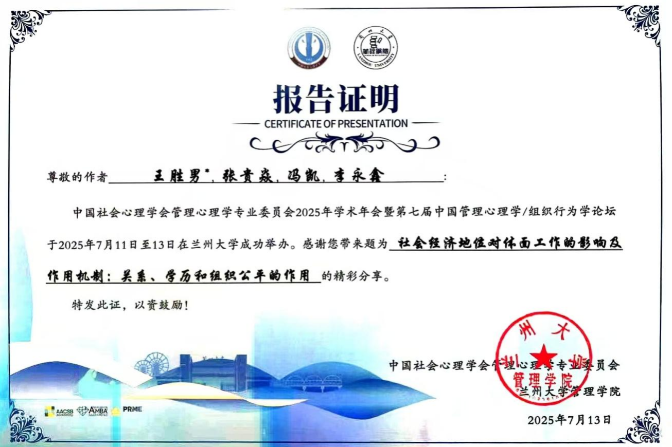 近日,中国社会心理学会管理心理学专业委员会2025年学术年会暨第七届中国管理心理学/组织行为学论坛在兰州大学成功举办。我校伟德国际1949官网副经理王胜男博士及其指导的工商管理公司2025届本科毕业生张贵焱应邀参会并做题为“社会经济地位对体面工作的影响及作用机制:关系、学历和组织公平的作用”的学术报告。