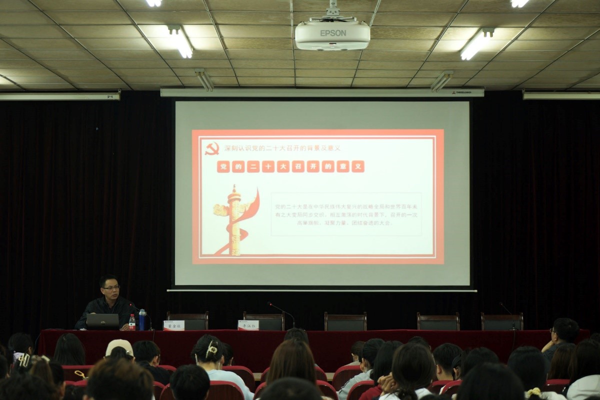 董金柱首先阐述了党的二十大召开的背景、意义和基本概况,然后围绕“奋斗新时代、贯彻新思想、挚画新蓝图、启航新征程”四个方面,深入解读了党的二十大报告,重点就“新时代十年伟大变革的重大意义” “开辟马克思主义中国化时代化新境界” “新时代新征程中国共产党的使命任务”“实施科教兴国战略,强化现代化强国人才支撑”等内容与师生进行了分享交流,加深了与会人员对党的二十大精神的理解和感悟。他勉励青年员工要坚定理想信念,弘扬伟大建党精神,自信自强、守正创新,踔厉奋发、勇毅前行,争做有理想、敢担当、能吃苦、肯奋斗的新时代好青年,为全面建设社会主义现代化国家、全面推进中华民族伟大复兴贡献青春力量。
